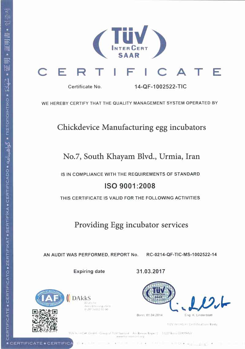 کسب گواهینامه استاندارد ایزو 9001 - 2008 در تولید دستگاه های جوجه کشی
